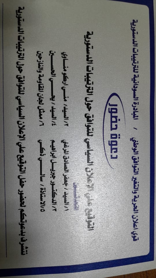 توقع قوى إعلان الحرية والتغيير التوافق الوطني، والمبادرة السودانیة للترتيبات الدستورية، بفندق كورنثيا بالخرطوم يوم السبت على إعلان سياسي للتوافق حول الترتيبات الدستورية.
