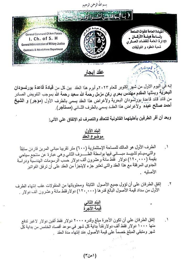 وأوضح عبده في مظلمته التي دفع بها أنه قام باستئجار مساحة تبلغ (٦٠٠) متر مربع تخص سلاح البحرية جوار مسرح الثغر وقام بتوقيع عقد مع قيادة قاعدة بورتسودان البحرية وفقاً لعقد قانوني وخرط معتمدة من القاعدة وأوضح أنه قام بتشييد منتجع سياحي ضخم وأنفق فيه نحو (٩٠٠) مليون جنيه بجانب التزامه بسداد الإيجارات الشهرية حتي شهر ديسمبر الماضي لمدة عام كامل بواقع الف دولار شهريا وقال إنه فوجيء بوقفه عن العمل من قبل والي الولاية الفريق ركن مصطفي محمد نور شفاهة وأبلغه أن الأرض تخص حكومة الولاية بعد أن خسر فيها مبالغ طائلة.