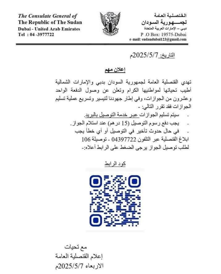 أصدرت إدارة الإعلام بالقنصلية العامة لجمهورية السودان ب دبي إعلانا هاما أكدت خلاله وصول دفعة الجوازات الجديدة ، حيث وفرت خدمة التوصيل عبر البريد مقابل رسوم قدرها 15 درهم .. في الأثناء حددت كود للمتابعة .