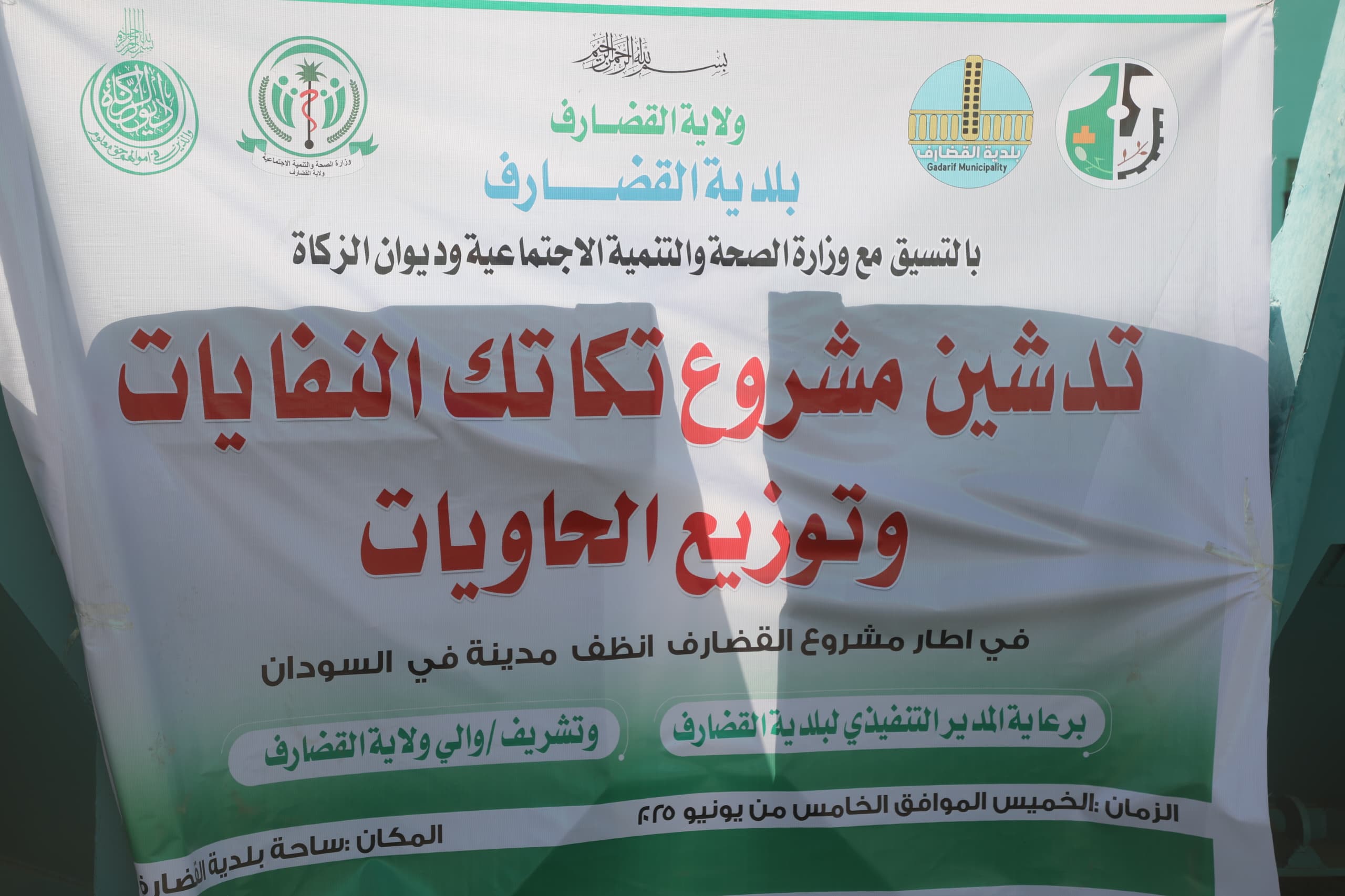 دشن والى القضارف المكلف الفريق الركن محمد احمد حسن احمد بساحة بلدية القضارف بحضور مدير عام وزارة الصحة والتنمية الاجتماعية د/ احمد الامين ادم ومدير عام وزارة المالية والقوى العاملة نجاة احمد محمد ابراهيم وممثل ديوان الزكاة بالولاية الاستاذ ماهر الامين مختار وعدد من الادارات التخطيطية بالديوان والجهاز التنفيذي لبلدية القضارف دشن الدفعة الاولى من مشروع تكاتك وحاويات نقل النفايات والذى يشمل ١٠٠ تكتك و٢٥ حاوية المنفذ عبر ديوان الزكاة ووزارة المالية والصحة والذى يستهدف الاسر الفقيرة في اطار مشروع القضارف انظف مدينة بالسودان