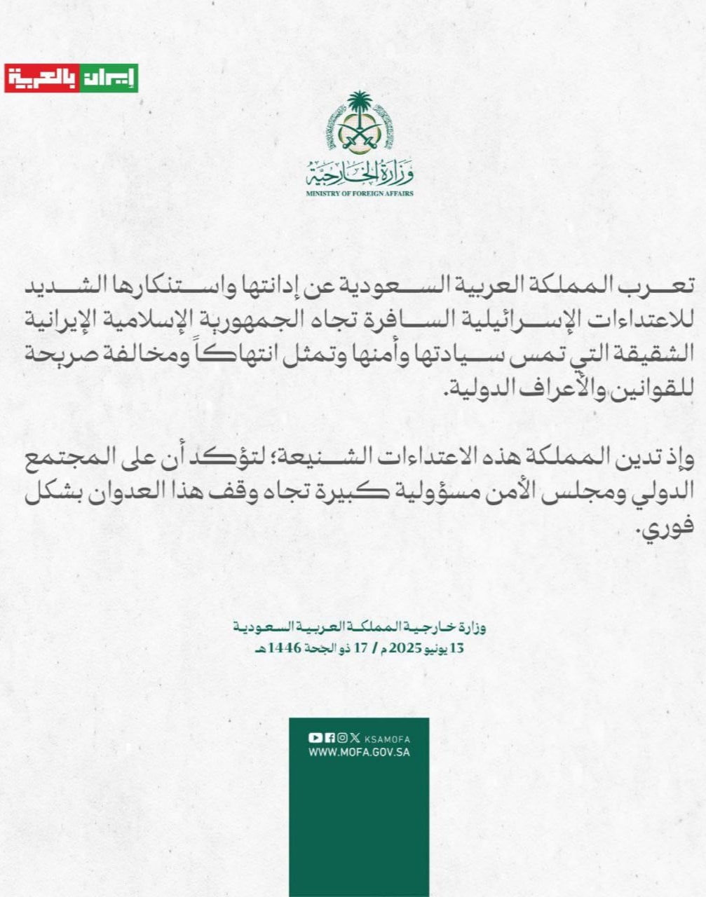 اصدرت المملكة العربية السعودية بيانا أعربت فيه عن إدانتها واستنكارها الشديد «للاعتداءات الإسرائيلية ، ووصفت ذلك بالسافرة تجاه الجمهورية الإسلامية الإيرانية الشقيقة التي تمس سيادتها وأمنها وقالت السعودية ذلك يمثل انتهاكًا ومخالفةً صريحة للقوانين والأعراف الدولية».