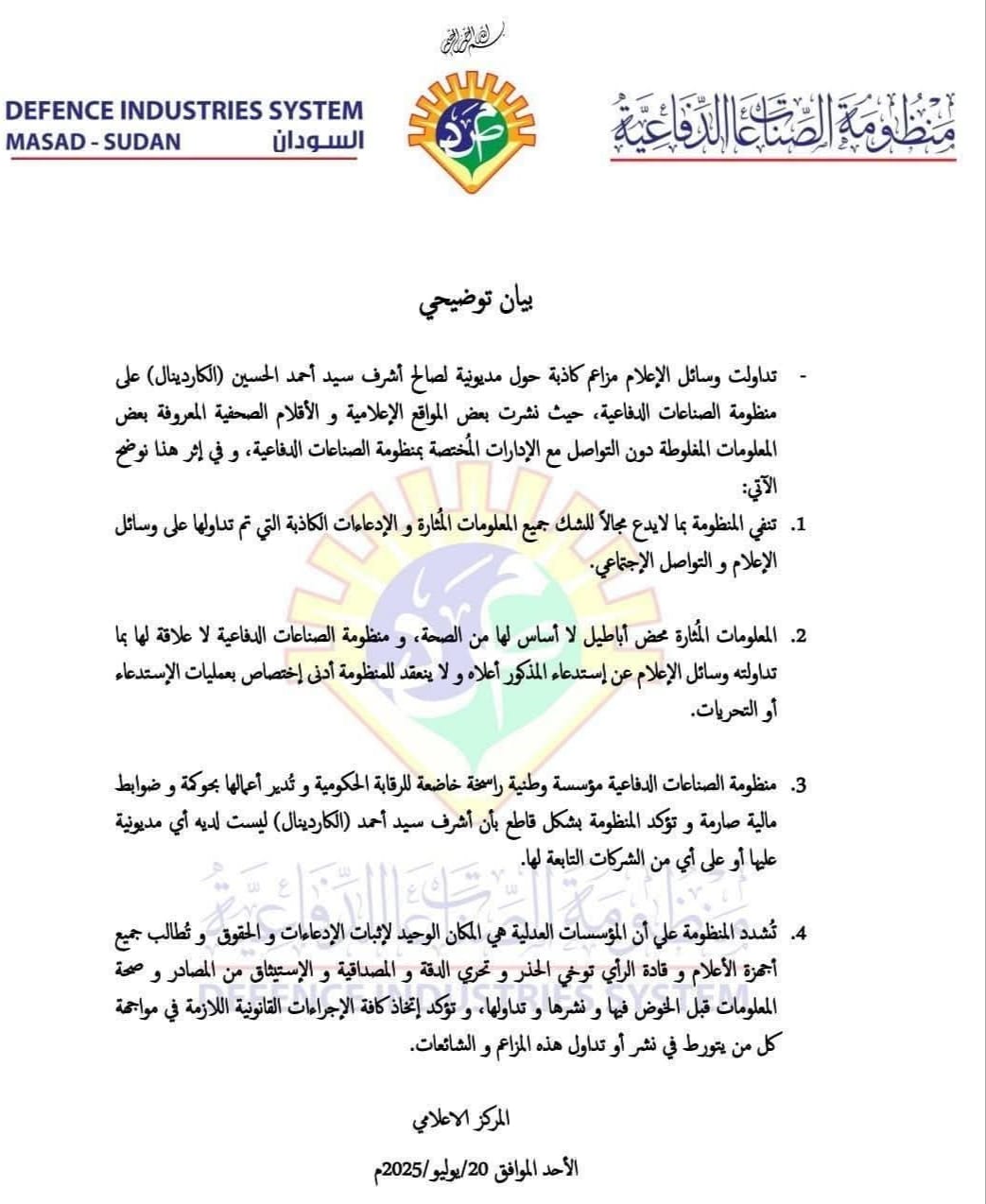 أصدرت منظومة الصناعات الدفاعية ( مجموعة شركات حكومية سودانية ) بيانا نفت فيه صلتها باعتقال رجل الأعمال أشرف سيد احمد الحسين الشهير ب " الكاردينال "