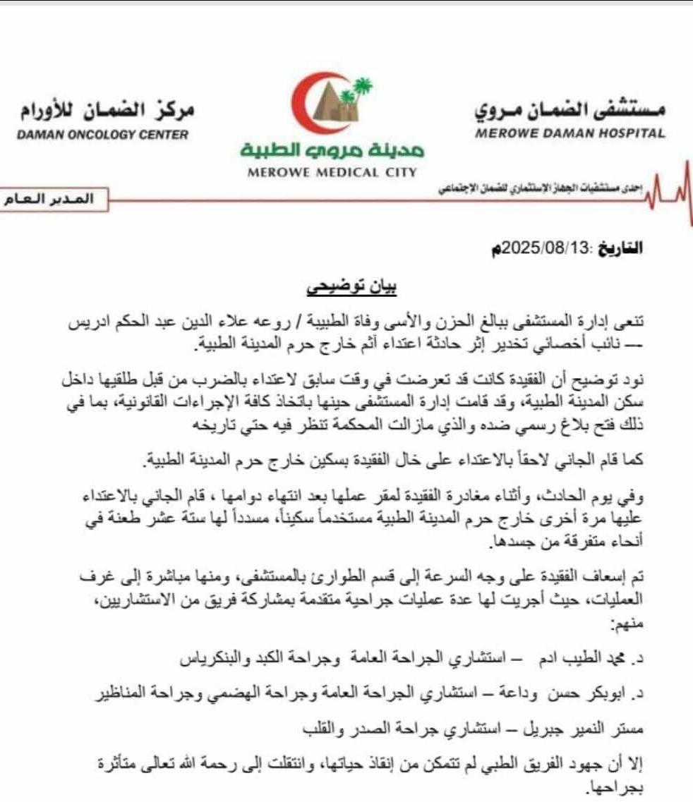 أصدر مستشفى الضمان ـ مروي بيان نعى خلاله نائبة الاخصائي روعة علاء الدين التي اغتالها طليقها غدرا ، وقال البيان بأن الجاني سدد لها ستة عشر طعنة وحاول الأطباء إنقاذها لكن نفذ القدر وليت نداء ربها ، حيث ذكر البيان بأن الجاني سبق له الاعتداء عليها بالضرب ودون في مواجهته بلاغ ما زالت محاكمته تجري ..