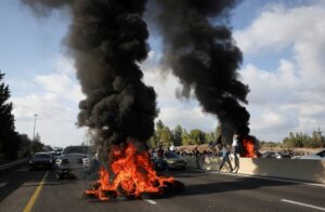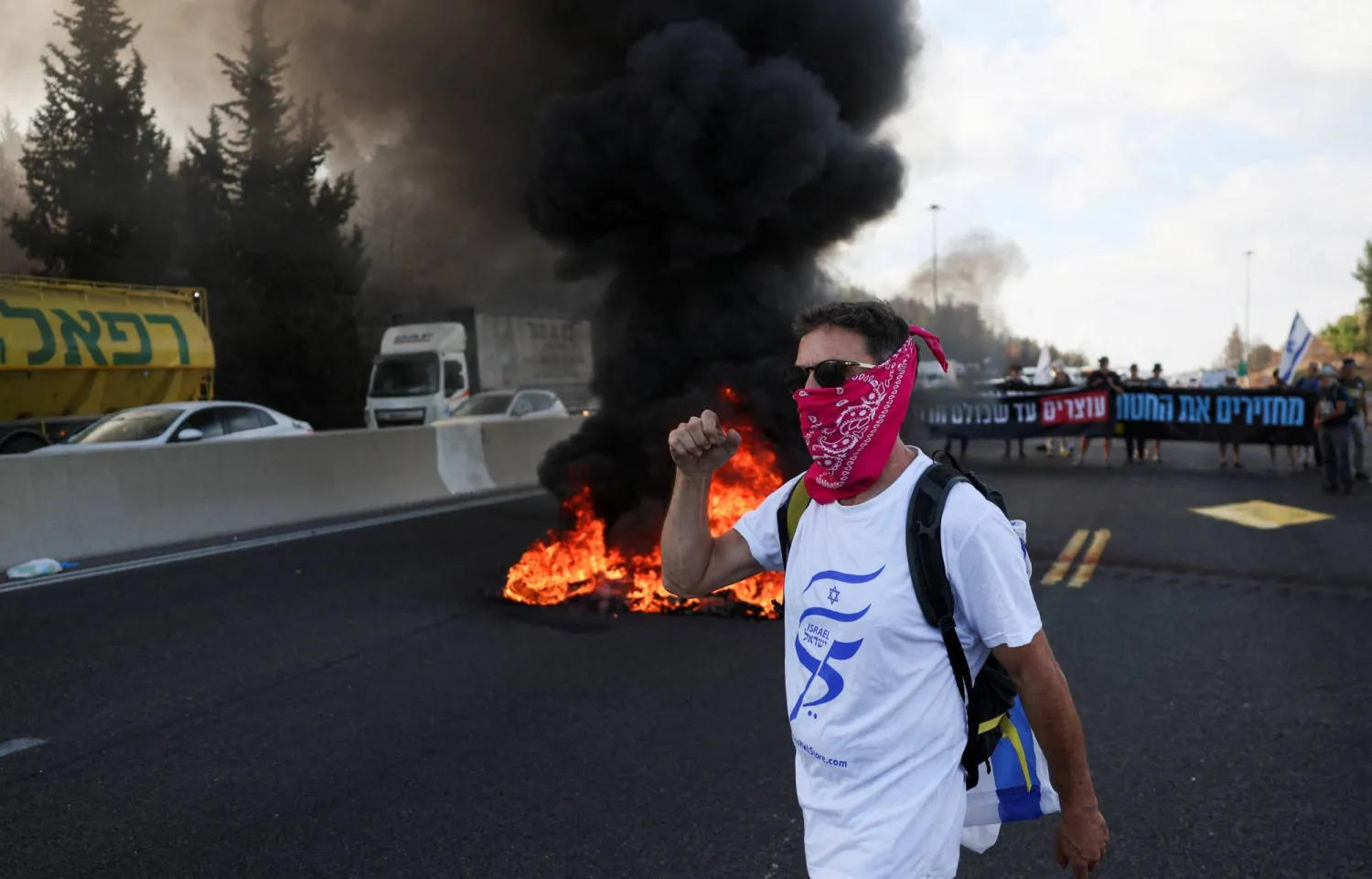 وأغلق المتظاهرون طرقاً رئيسية في المدينة، من بينها الطريق السريع الذي يربط تل أبيب بالقدس، وأشعلوا إطارات سيارات، متسببين باختناقات مرورية وفقاً لوسائل إعلام محلية. ودعا المتظاهرون و«منتدى عائلات الرهائن والمحتجزين» إلى إضراب شامل في كل أنحاء إسرائيل.