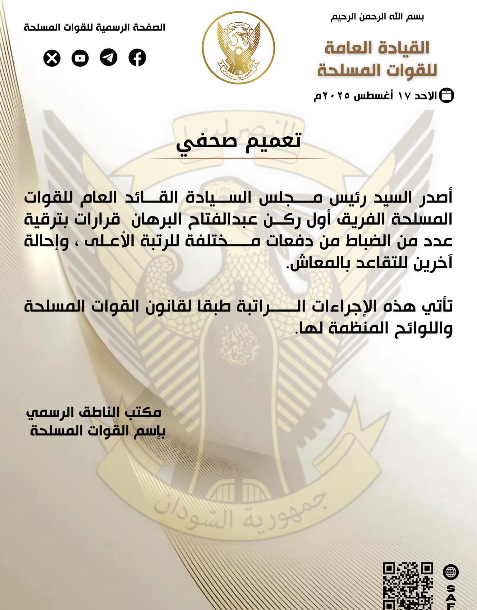 أصدر السيد رئيس مجلس السيادة القائد العام للقوات المسلحة الفريق أول ركن عبدالفتاح البرهان قرارات بترقية عدد من الضباط من دفعات مختلفة للرتبة الأعلى ، وإحالة آخرين للتقاعد بالمعاش.