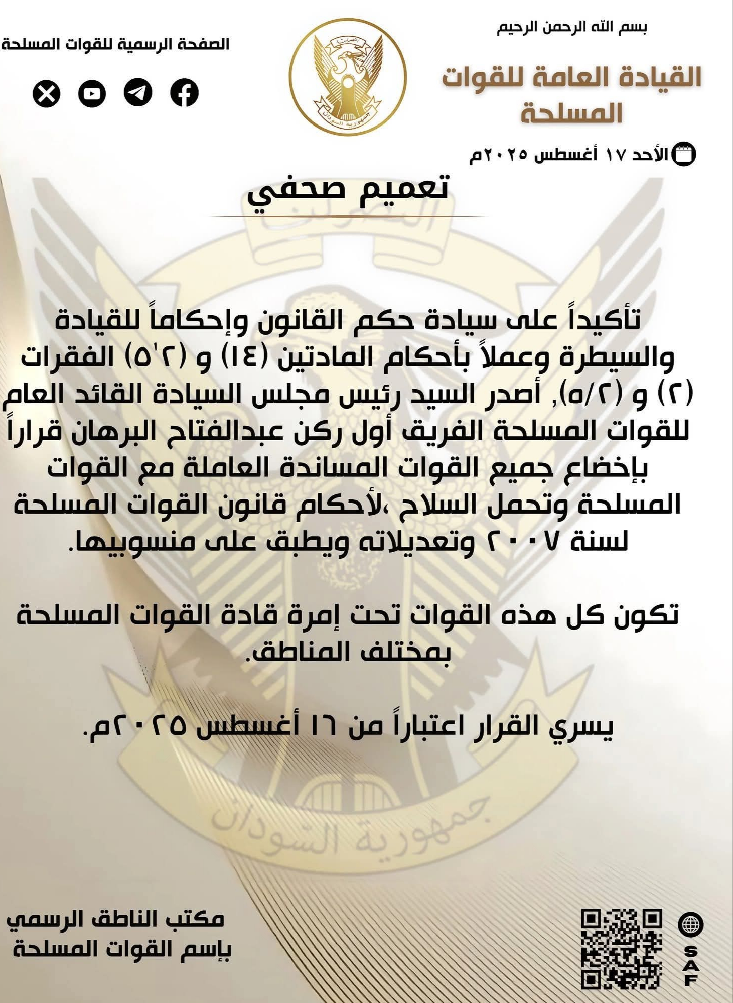 تأكيداً على سيادة حكم القانون وإحكاماً للقيادة والسيطرة وعملاً بأحكام المادتين (١٤) و (٢’٥) الفقرات (٢) و (٢/ه), أصدر السيد رئيس مجلس السيادة القائد العام للقوات المسلحة الفريق أول ركن *عبدالفتاح البرهان* قراراً بإخضاع جميع القوات المساندة العاملة مع القوات المسلحة وتحمل السلاح ،لأحكام قانون القوات المسلحة لسنة ٢٠٠٧ وتعديلاته ويطبق على منسوبيها.