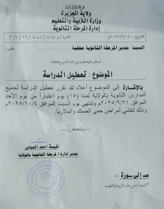 أعلنت وزارة التربية والتوجيه بولاية الجزيرة، اليوم الخميس، عن تعطيل الدراسة في جميع المدارس الثانوية بمختلف محليات الولاية، وذلك ابتداءً من يوم غدٍ ولمدة غير محددة، نتيجة لتفشي حمى الضنك والملاريا بصورة لافتة خلال الأيام الماضية.