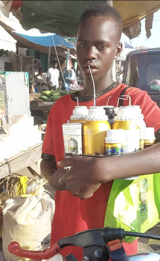 أبوبكر هارون (12 عاماً): يعمل بائعاً متجولاً، يقول: “الحرب أجبرتنا… الوضع صعب والبيع ضعيف… تركت المدرسة وما قادر أرجع.”