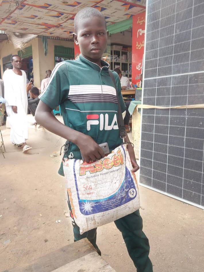 عثمان إبراهيم (11 عاماً): يبيع الأكياس بالسوق بعد وفاة والده: “أشتغل أنا وأخوي عشان نأكل أهلنا.”