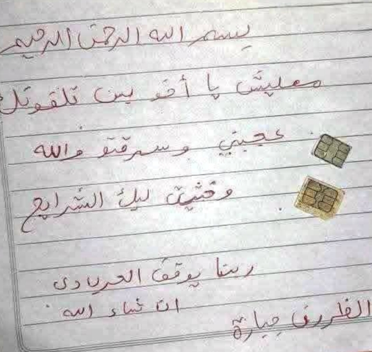 تفاجأ أحد المواطنين السودانيين برسالة رقيقة من السارق الذي استولى على هاتفه الجوال ( موبايل ) ، حيث كتب على وريقة بالقلم الأحمر قائلا : ( معليش يا أخو بس تلفونك عجبني وسرقتو وخايت ليك الشرائح ، ربنا يوقف الحرب ، معليش الظروف جبُارة ) ، وبالفعل وجد صاحب الهاتف الورقة ملفوفة دانلها شرائح الاتصالات .