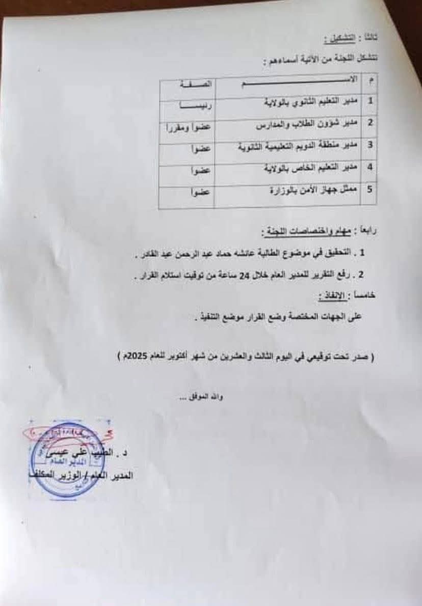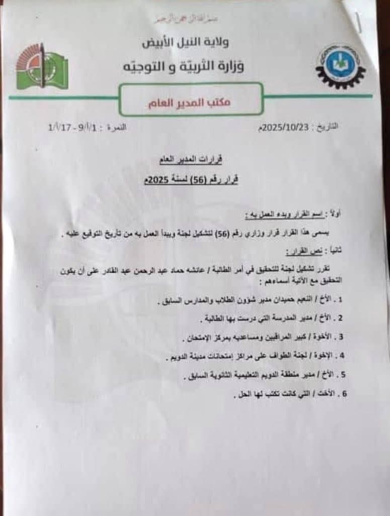 أصدر وزير التربية والتعليم بولاية النيل الأبيض قراراً بتكوين لجنة تحقيق رسمية للنظر في قضية الطالبة عائشة حماد، التي أثارت جدلاً واسعاً في الأوساط التعليمية والرأي العام خلال الأيام الماضية، عقب