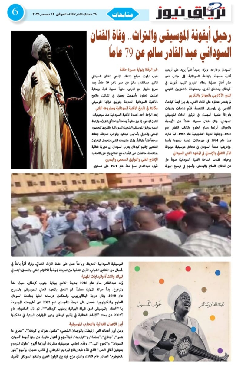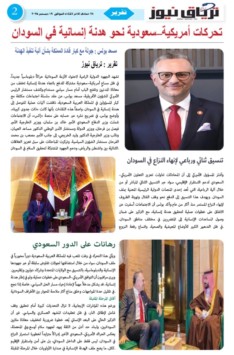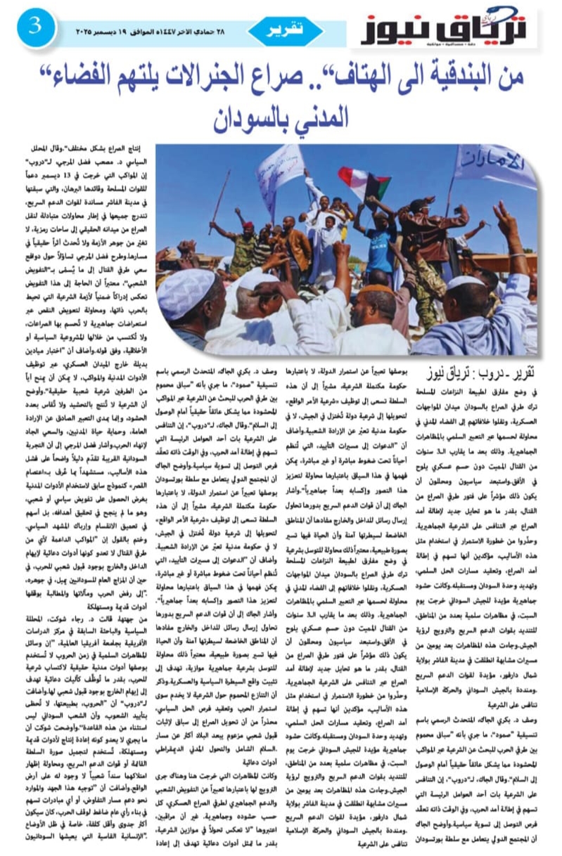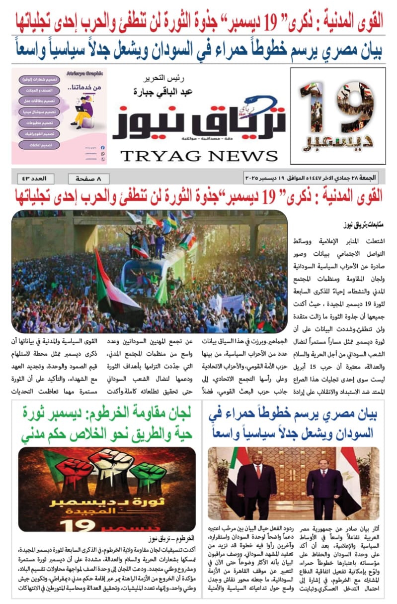 أبرز المواضيع صحيفة ترياق نيوز بي دي اف العدد (43) الصادر الجمعة 19 ديسمبر 2025م ترياق نيوزديسمبر 24, 2025 Oplus_131072 مقالات ذات صلة غوتيريش يعيّن بيكا هافيستو مبعوثاً أممياً إلى السودان خلفاً لرمطان لعمامرة فبراير 25, 2026 مجلس الأمن يفرض عقوبات دولية على 4 من قادة الدعم السريع بتهم تهديد أمن السودان وارتكاب انتهاكات جسيمة فبراير 25, 2026 اضغط هنا للانضمام الى مجموعاتنا في واتساب ترياق نيوزديسمبر 24, 2025 فيسبوك X واتساب تيلقرام