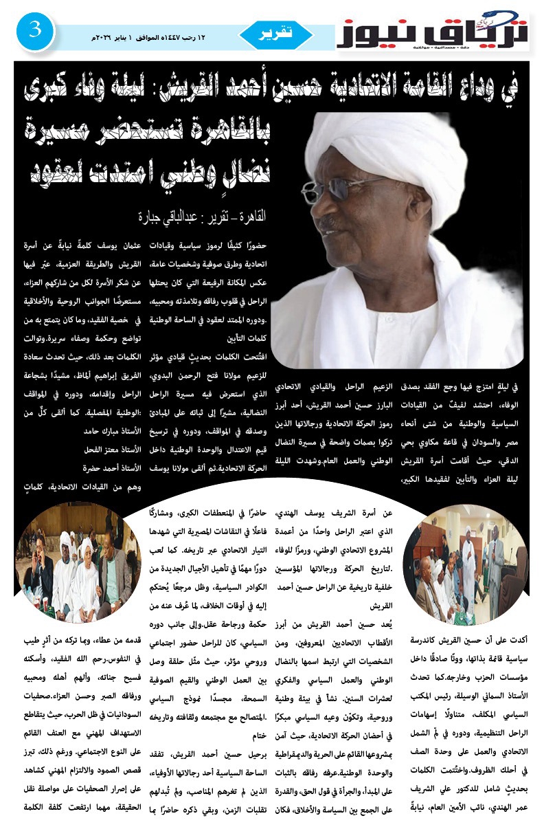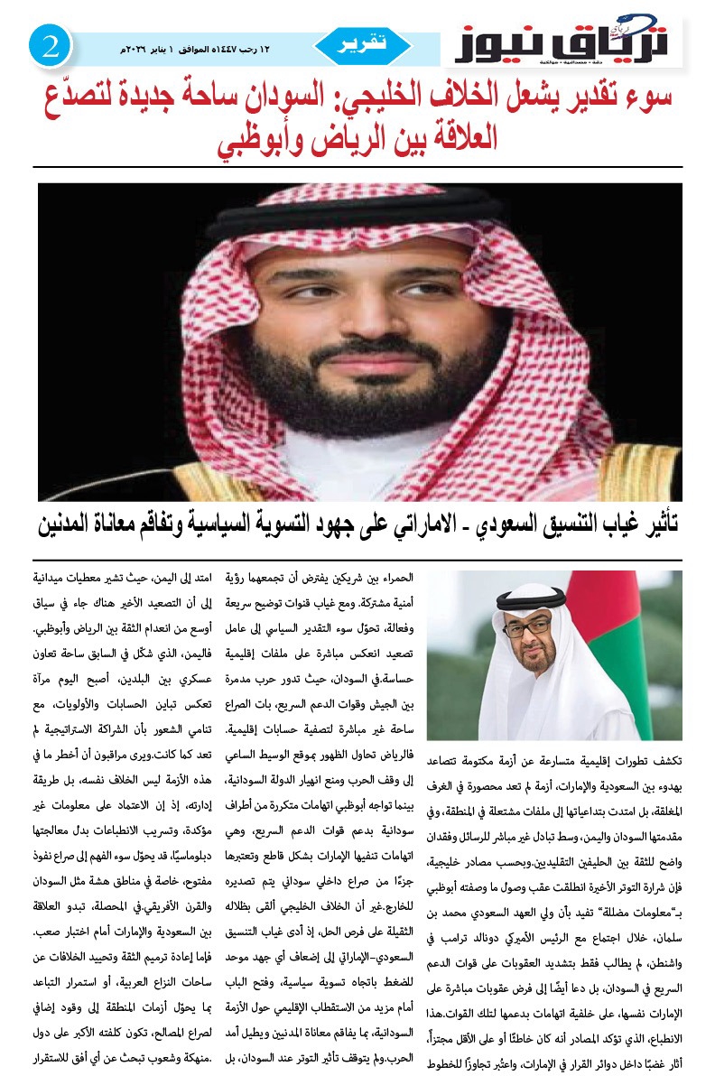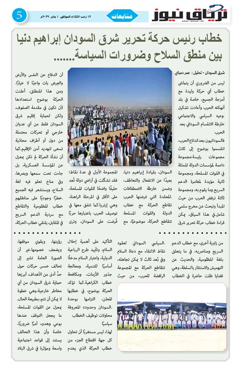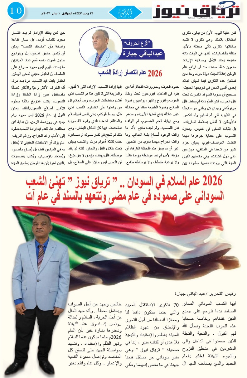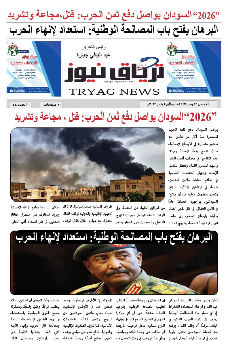 أبرز المواضيع العدد (44) من صحيفة ترياق نيوز بي دي إف الصادر الخميس 1 يناير 2026م ترياق نيوزيناير 4, 2026 Oplus_131072 مقالات ذات صلة أوغندا تفتح مكتب تمثيل لحكومة التأسيس في كمبالا… وتوقعات بانضمام إنجمينا وأديس أبابا ونيروبي فبراير 22, 2026 مجلس الأمن والدفاع السوداني يعقد اجتماعاً طارئاً لمناقشة «تصريحات مستشار ترمب» حول الهدنة الإنسانية ويكلف جهات بالرد رسمياً فبراير 22, 2026 اضغط هنا للانضمام الى مجموعاتنا في واتساب ترياق نيوزيناير 4, 2026 فيسبوك X واتساب تيلقرام