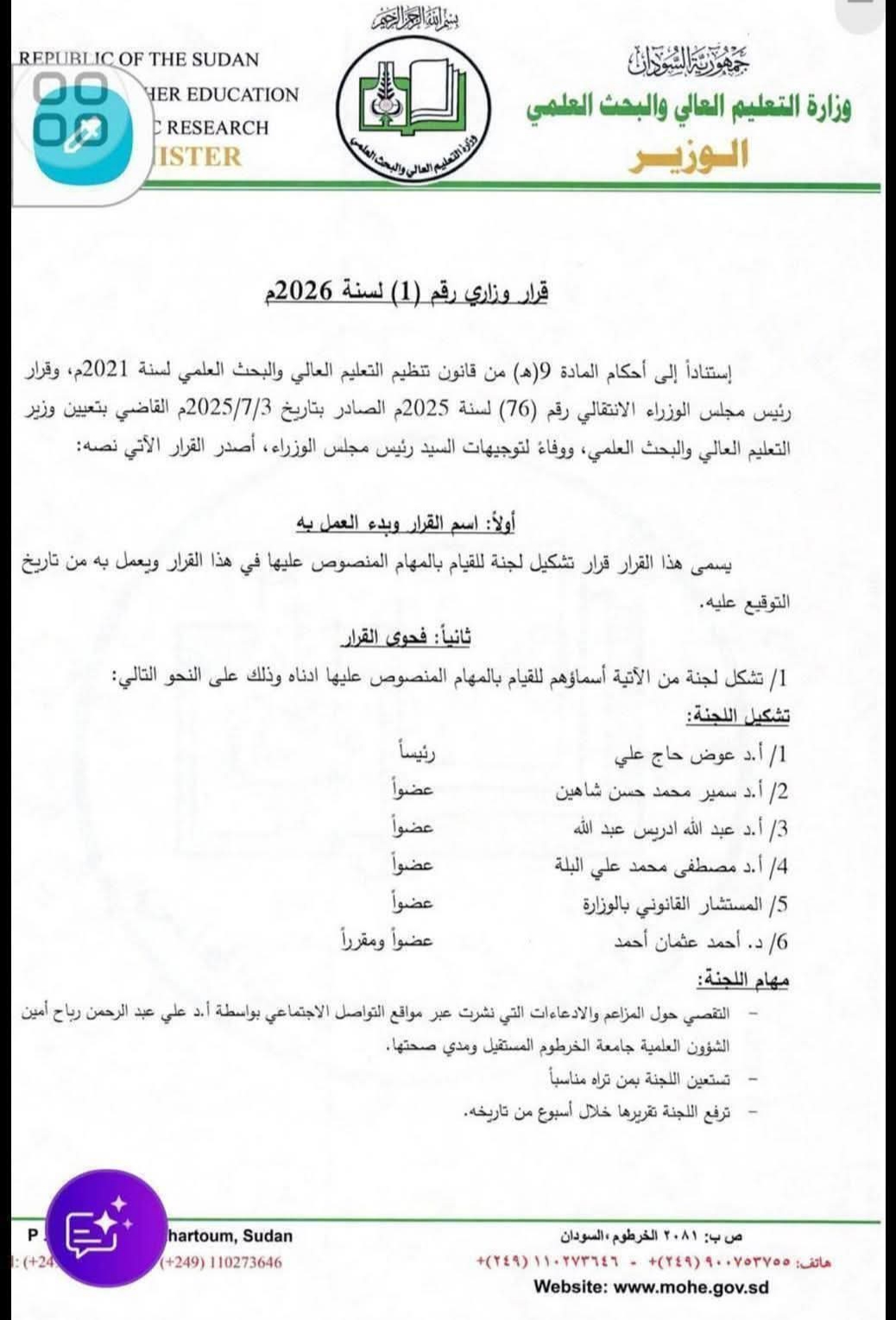 أعلنت وزارة التعليم العالي والبحث العلمي السودانية اليوم عن تشكيل لجنة تحقيق رسمية برئاسة البروفيسور عوض حاج علي للتحقيق في ما ورد في خطاب استقالة أمين الشؤون العلمية بجامعة الخرطوم