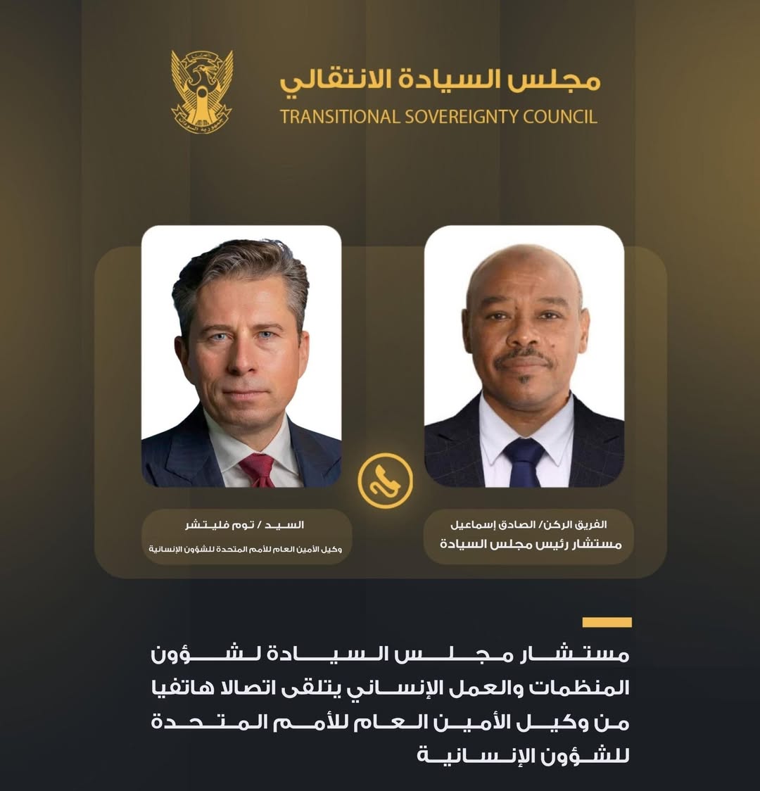 تلقى الفريق الركن الصادق إسماعيل مستشار مجلس السيادة لشؤون المنظمات والعمل الإنساني اتصالاً هاتفياً من السيد توم فلتشر وكيل الأمين العام للأمم المتحدة للعمليات الإنسانية، وذلك للوقوف على الوضع الإنساني والتعرف على الوصول الإنساني بالبلاد.