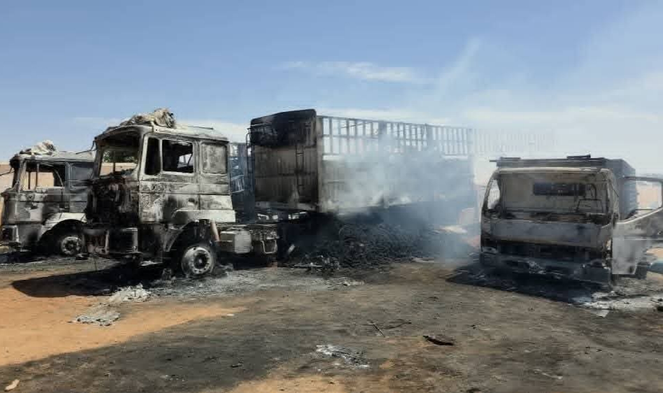 وأفادت مصادر محلية أن الشاحنات كانت في طريقها لتزويد الأسواق بالسلع الأساسية، في وقت تعاني فيه المدينة ومناطق واسعة من الولاية من نقص حاد في المواد الغذائية وارتفاع كبير في الأسعار، نتيجة تدهور الأوضاع الأمنية وتعطل خطوط الإمداد.