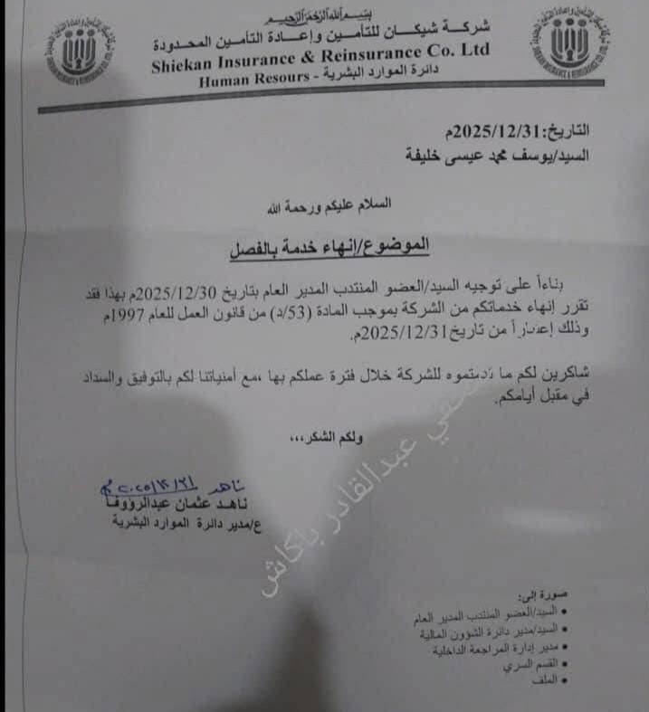 فقد علمتُ أن السيد المدير العام للشركة أقدم على فصل مسؤول المراجعة الداخلية، الأستاذ يوسف محمد عيسى خليفة، على خلفية تمسّكه بتطبيق اللوائح والسياسات المالية المعتمدة.