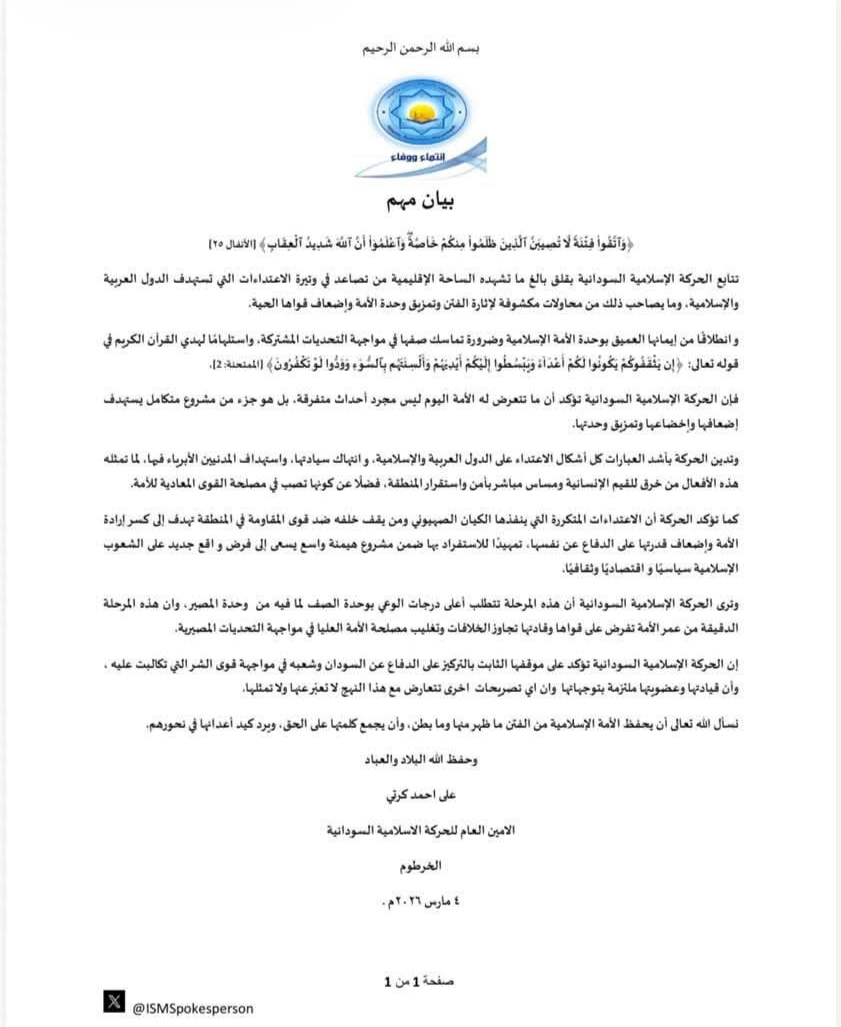 الحركة الإسلامية السودانية: الاعتداءات على دول المنطقة جزء من مشروع لإضعاف الأمة ونؤكد التزامنا بالدفاع عن السودان وهذه الاصوات لا تمثلنا