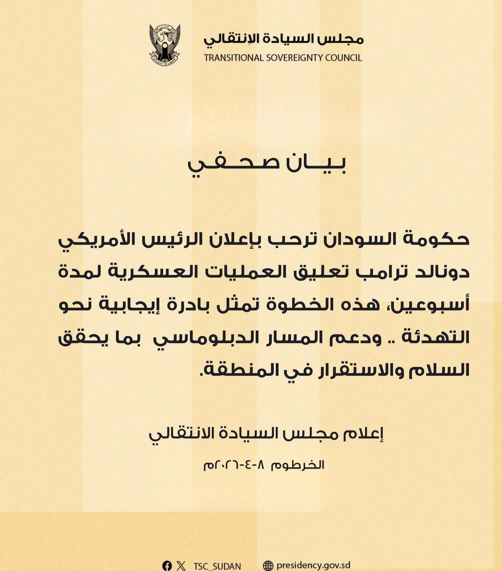 رحّبت حكومة السودان بإعلان الرئيس الأمريكي دونالد ترامب تعليق العمليات العسكرية لمدة أسبوعين، معتبرةً هذه الخطوة بادرة إيجابية تسهم في تهدئة الأوضاع المتوترة في المنطقة.
