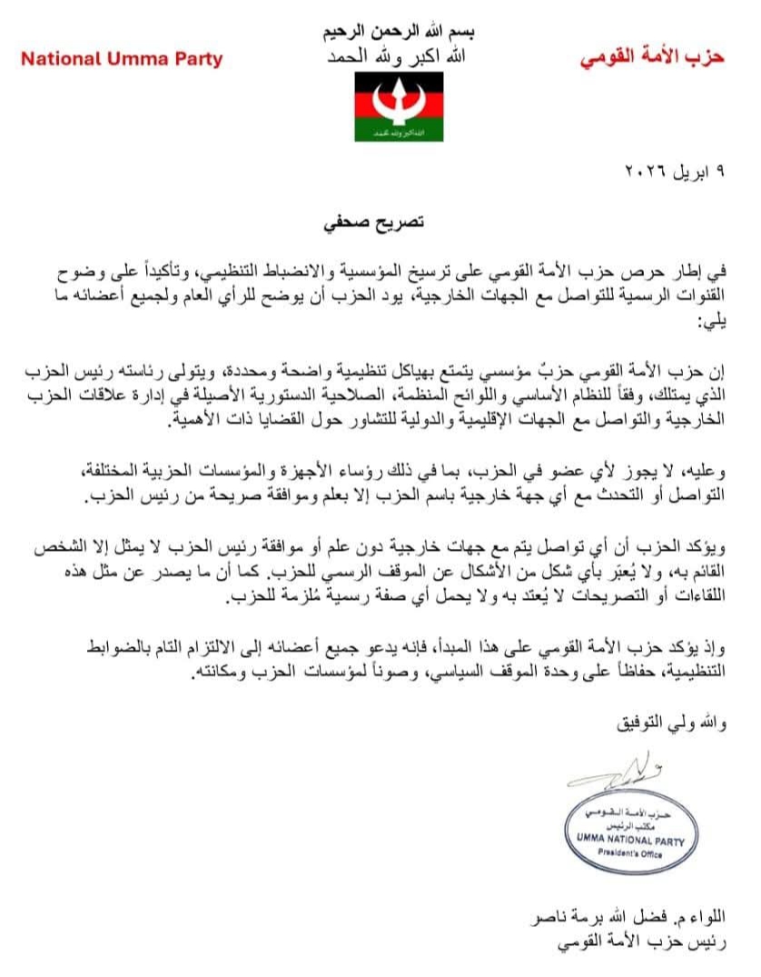 أكد حزب الأمة القومي التزامه الصارم بالمؤسسية والانضباط التنظيمي، مشددًا على حصر قنوات التواصل مع الجهات الإقليمية والدولية في شخص رئيس الحزب فقط، وفقًا لما ينص عليه النظام الأساسي واللوائح المنظمة.