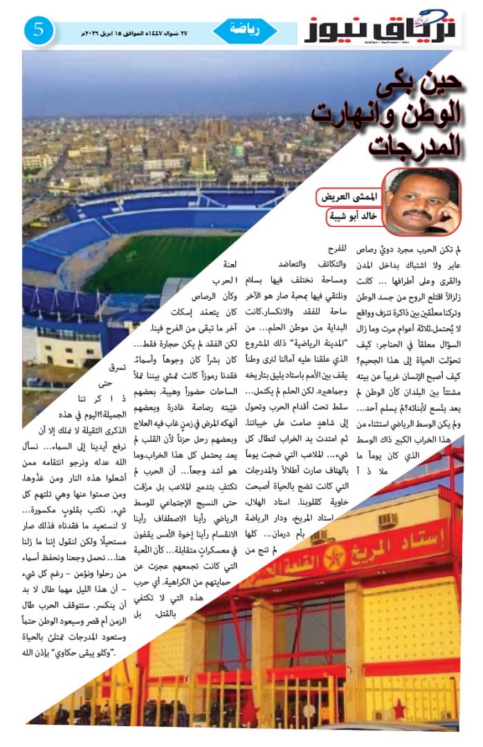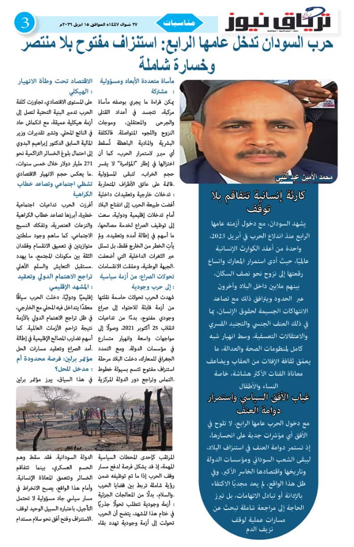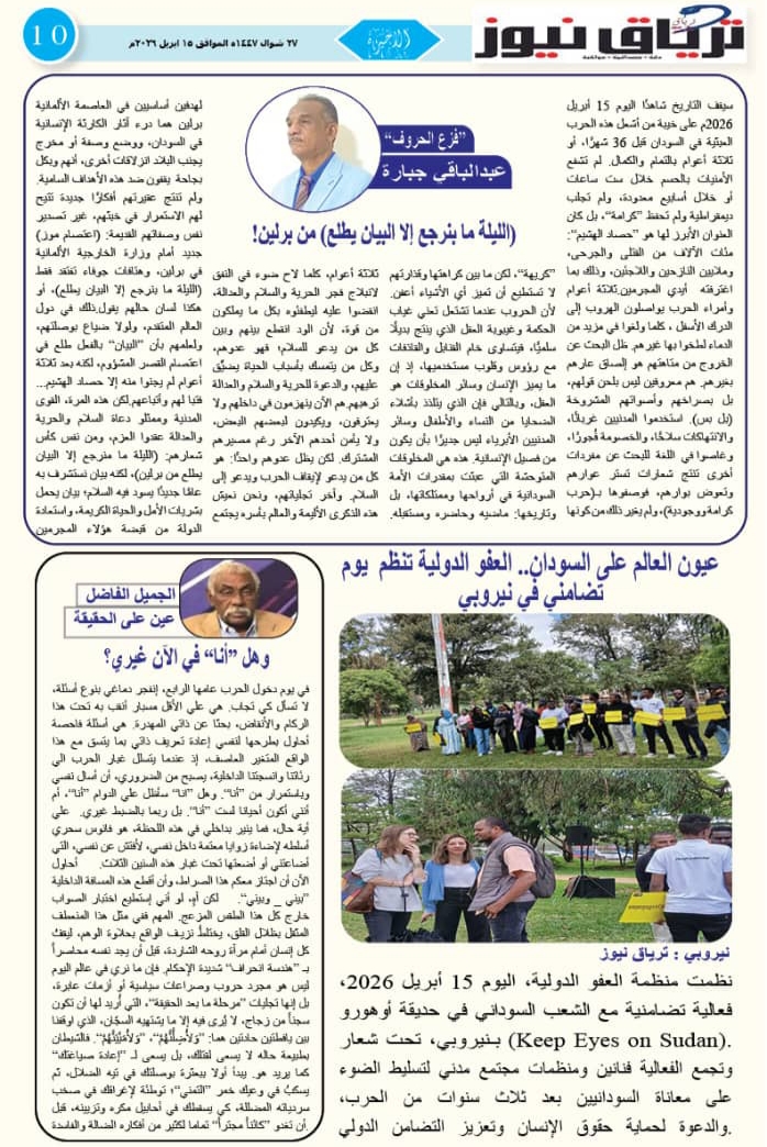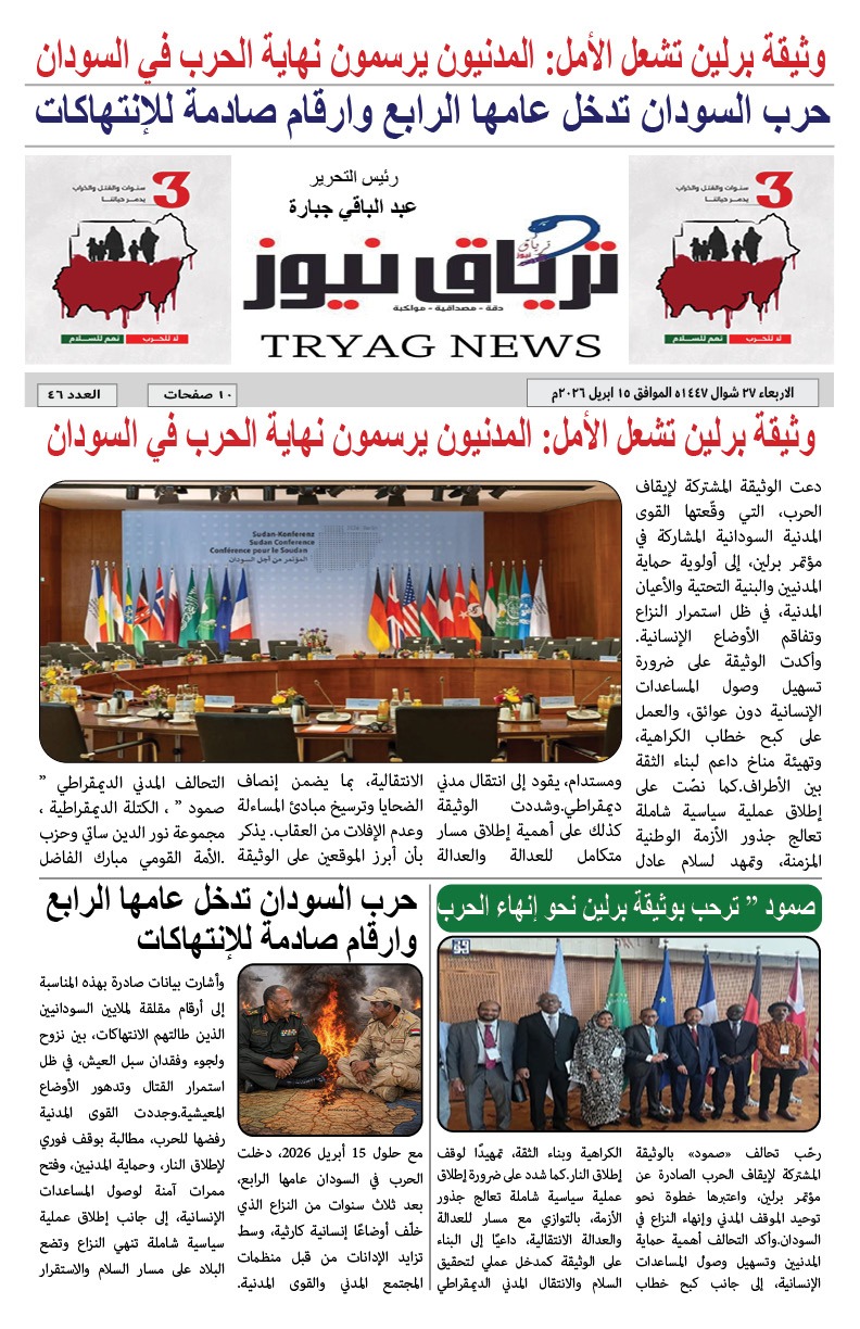 أبرز المواضيع صحيفة ترياق نيوز بي دي إف العدد 46 الذكرى الثالثة للحرب الصادر 15 ابريل 2026م ترياق نيوزأبريل 18, 2026 مقالات ذات صلة عاجل .. إحتدام المعارك في كردفان وتضارب الأنباء عن التقدم الميداني أبريل 18, 2026 مبعوث الإيقاد: لقاء جديد للقوى السودانية الشهر المقبل و«نداء برلين» تجاوز الخطوط الحمراء واختراق مهم نحو السلام أبريل 17, 2026 اضغط هنا للانضمام الى مجموعاتنا في واتساب ترياق نيوزأبريل 18, 2026 فيسبوك X واتساب تيلقرام